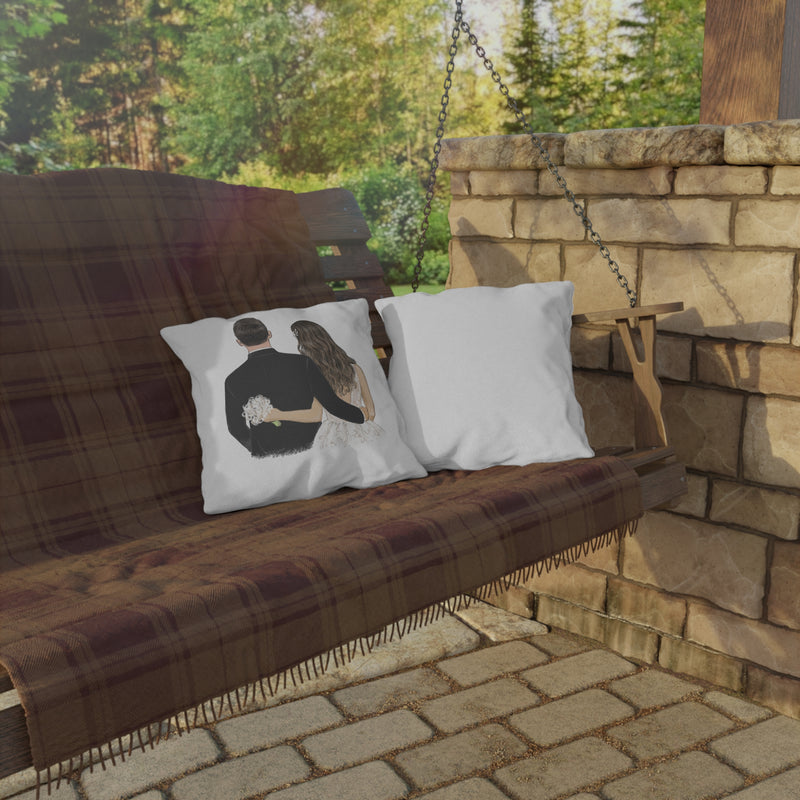 Soft, sun-ready pillows that hold a story in every stitch. Designed for those who treasure quiet moments and meaningful milestones, these outdoor pillows feature a tender illustration of a newlywed couple from behind — a gentle reminder of promises kept and days celebrated. The double-sided print keeps colors bright whether they sit on a porch swing or lean against a chaise by the pool. Water- and UV-resistant fabric means the scene stays vivid through afternoon light and summer showers, while the resilient spun-polyester fill keeps the pillow plump and welcoming. Bring a touch of wedding-day warmth to patios, garden nooks, or cozy corners where two people linger and remember.